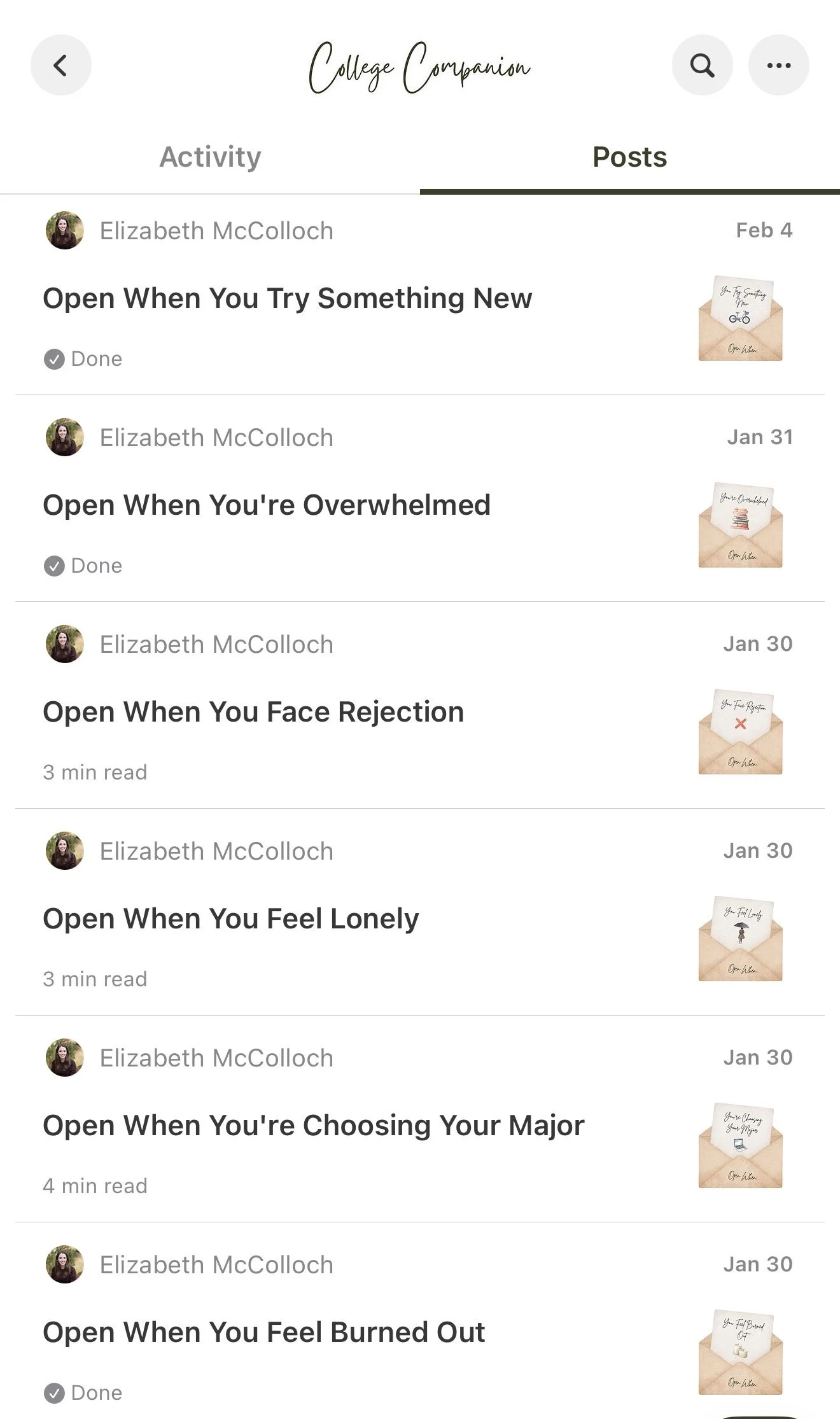 You will continue to have ongoing access to the content in case you want to return to the video encouragements or “Open When” letters. Much of the content is applicable beyond college. However, you can unsubscribe from the periodic Companion Check-Ins if you’d like.